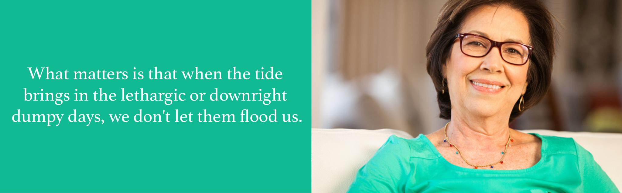 If you have lived the decades we have, you know that the good and bad flow past us like the tides. What matters is that when the tide brings in the lethargic or downright dumpy days, we don't let them flood us.