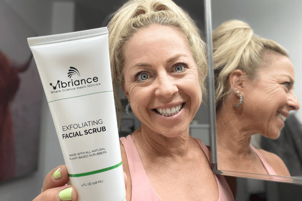 Make sure you find a gentle exfoliating scrub specific for aging skin. Vibriance's Exfoliating Facial Scrub is formulated for the 50+ woman and multitasks as a cleanser, so there is no need for an additional face wash after exfoliating.