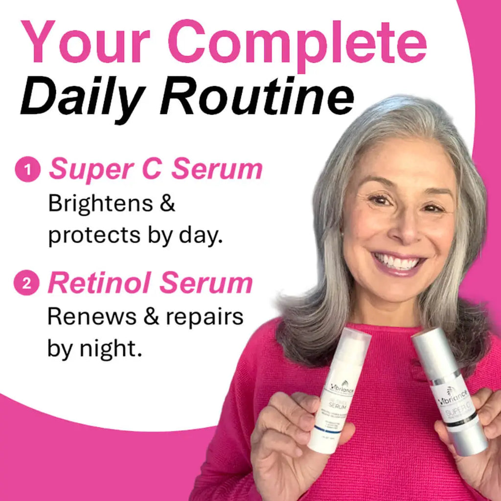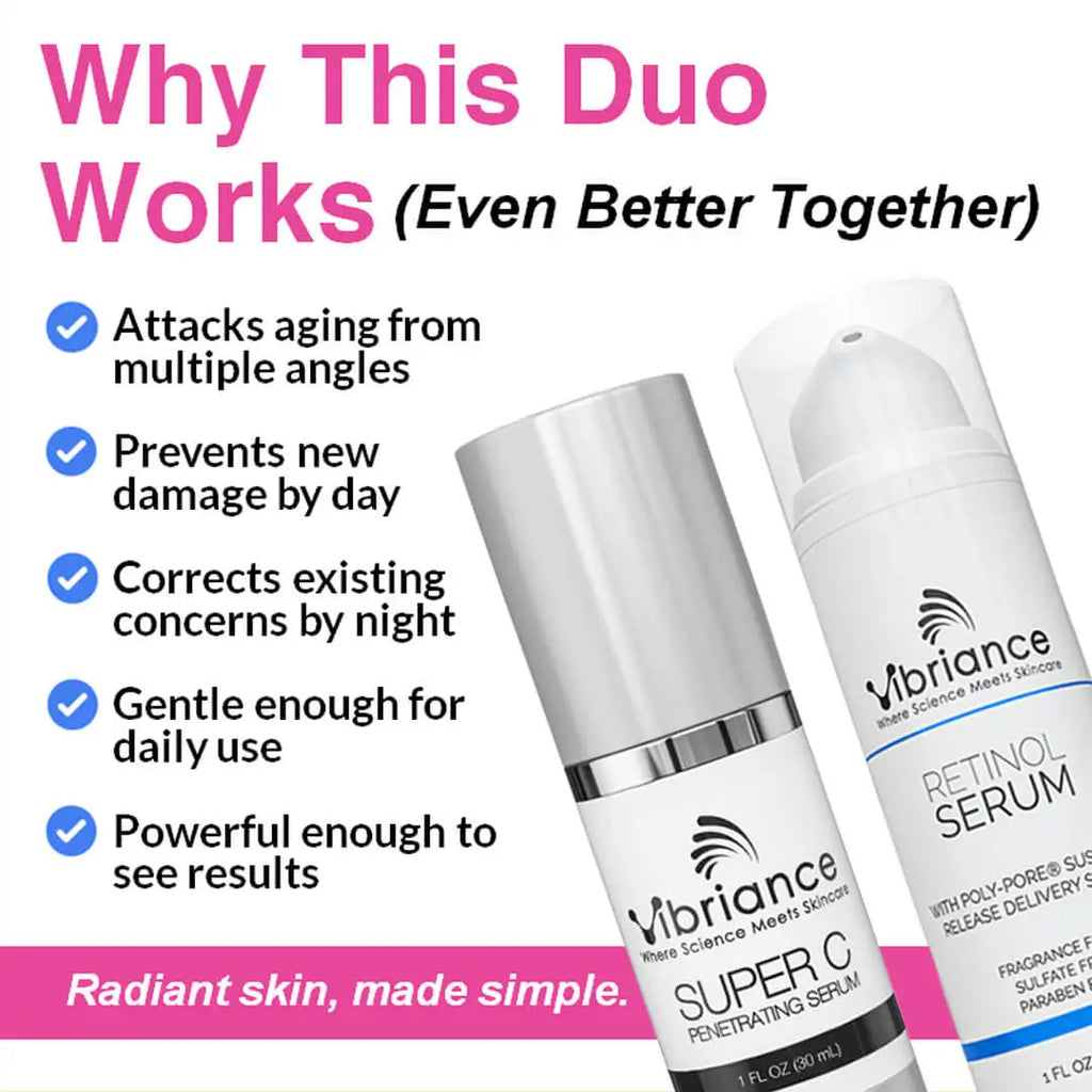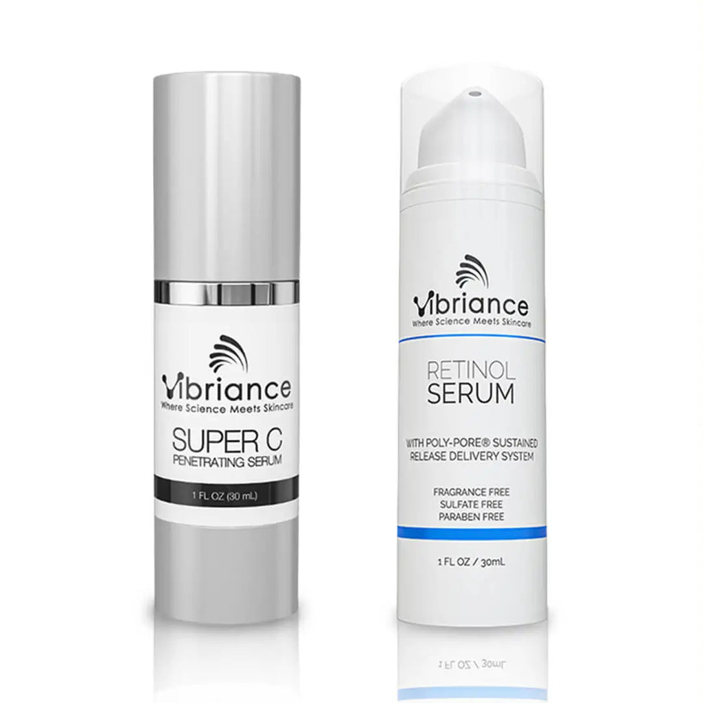 Get Vibriance Super C and Retinol Serums at an incredible value. We call it the dynamic duo because they work so great together. Simply Use Super C Serum in the morning and Retinol Serum at night for an incredibly smooth complexion.